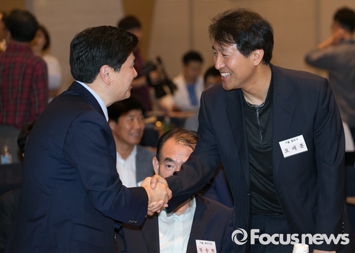 (서울=포커스뉴스) 11일 오후 서울 여의도 중소기업중앙회관에서 열린 새누리당 전국원외위원장협의회 전체회의에 참석한 오세훈(오른쪽) 종로구 위원장과 지상욱 대변인이 인사하고 있다.