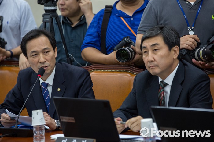 (서울=포커스뉴스) 국회 국방위원회 소속 우상호(왼쪽) 더불어민주당 원내대표가 11일 오후 서울 여의도 국회에서 열린 국방위원회 전체회의에 참석해 한민구 국방부 장관에게 사드배치 관련 질의 하고 있다.