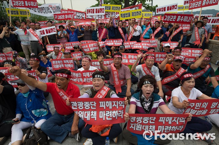 (서울=포커스뉴스) 금강산관광 중단 8년째를 맞아 금강산관광 중단 피해대응 고성군 추진위원회 회원들이 11일 오후 서울 종로구 서울정부청사앞에서 지원대책 마련을 촉구하며 집회를 갖고 있다.