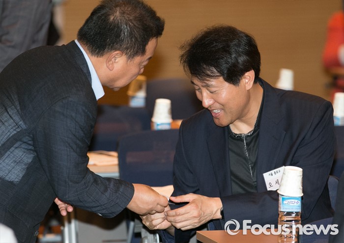 (서울=포커스뉴스) 11일 오후 서울 여의도 중소기업중앙회관에서 열린 새누리당 전국원외위원장협의회 전체회의에 참석한 오세훈(오른쪽) 종로구 위원장이 참석자들과 인사하고 있다.