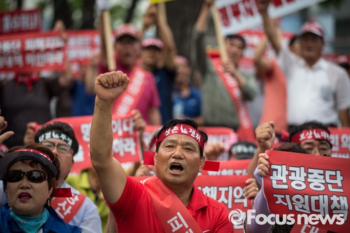 (서울=포커스뉴스) 금강산관광 중단 8년째를 맞아 금강산관광 중단 피해대응 고성군 추진위원회 회원들이 11일 오후 서울 종로구 서울정부청사앞에서 지원대책 마련을 촉구하며 집회를 갖고 있다.