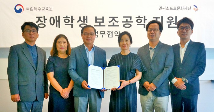 엔씨소프트문화재단과 국립특수교육원은 지난달 '장애학생 보조공학 기기 및 프로그램 개발․보급을 위한 민·관 업무협약'을 체결한 바 있다. 이번 공모전을 통해 접수된 우수한 아이디어는 향후 두 기관의 보조공학기기 및 프로그램 공동 개발에 활용될 계획이다.엔씨소프트문화재단과 국립특수교육원의 협약식 모습 <사진제공=엔씨소프트>