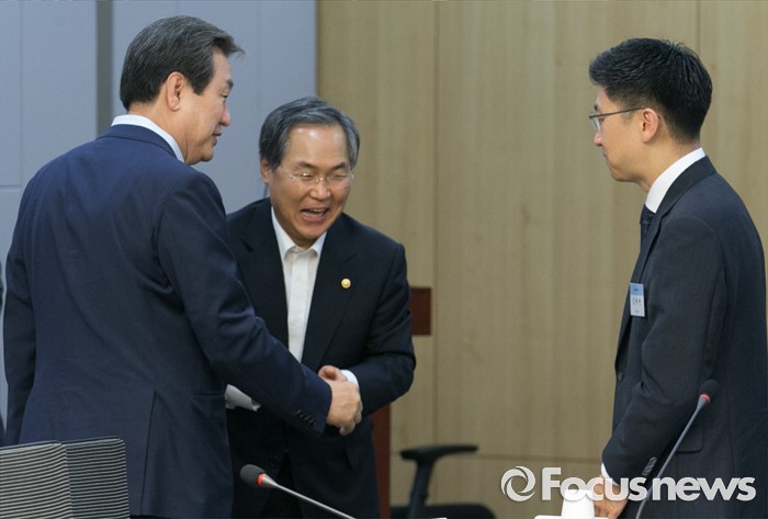(서울=포커스뉴스) 12일 오전 서울 여의도 국회 의원회관에서 국가전략포럼 주최로 열린 국민이 바라는 개헌, 어떻게 할 것인가? 세미나에 참석한 김무성(왼쪽) 새누리당 전 대표와 우윤근(가운데) 국회 사무총장이 인사하고 있다. 오른쪽은 김세연 새누리당 의원.