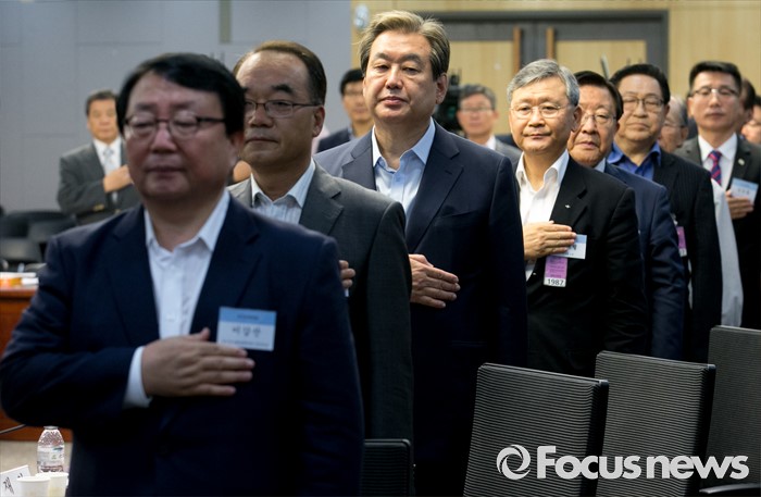 (서울=포커스뉴스) 12일 오전 서울 여의도 국회 의원회관에서 국가전략포럼 주최로 열린 국민이 바라는 개헌, 어떻게 할 것인가? 세미나에 참석한 김무성(왼쪽 세번째) 새누리당 전 대표 등 참석자들이 국기에 대한 경례를 하고 있다.