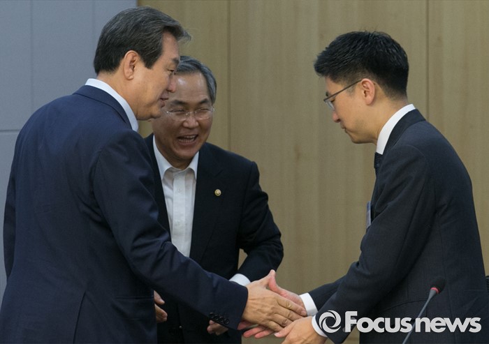 (서울=포커스뉴스) 12일 오전 서울 여의도 국회 의원회관에서 국가전략포럼 주최로 열린 국민이 바라는 개헌, 어떻게 할 것인가? 세미나에 참석한 김무성(왼쪽) 새누리당 전 대표와 김세연(오른쪽) 의원이 인사하고 있다. 가운데는 우윤근 국회 사무총장.