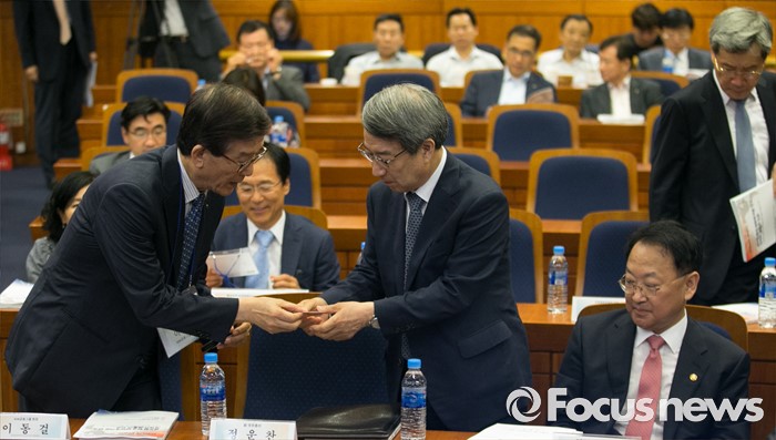 (서울=포커스뉴스) 12일 오전 서울 여의도 국회 헌정기념관에서 열린 글로벌금융학회 정책심포지엄에 참석한 정운찬(가운데) 전 국무총리와 이동걸(왼쪽) KDB산업은행 회장이 인사하고 있다. 오른쪽은 유일호 경제부총리 겸 기획재정부 장관.