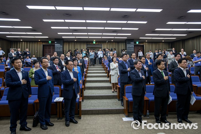 (서울=포커스뉴스) 박지원(왼쪽 세 번째) 국민의당 비상대책위원장을 비롯한 의원들이 12일 오전 서울 여의도 국회에서 열린 의원총회에 참석해 국민의례하고 있다.