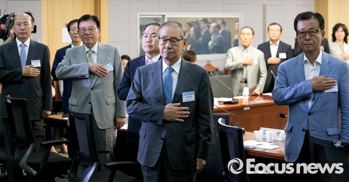 이어 "여야 간에 패권 세력과 그 중심인물이 분명하게 형성돼 있지 않는다는 점이 보다 자유로운 논의를 가능케 한다"며 20대 국회내 개헌에 대한 기대감을 드러냈다.12일 오전 서울 여의도 국회 의원회관에서 국가전략포럼 주최로 열린 국민이 바라는 개헌, 어떻게 할 것인가? 세미나에 참석한 원혜영(앞줄 오른쪽부터) 더불어민주당 의원, 김진현 세계평화포럼 이사장, 우윤근 국회 사무총장, 김덕룡 민주화추진협의회 이사장 등이 국기에 대한 경례를 하고 있다. 2016.07.12 박동욱 기자