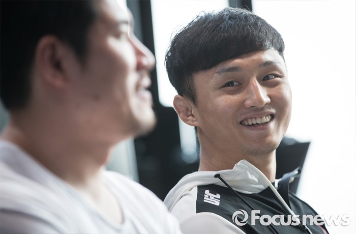 (서울=포커스뉴스) 지난 9일 티아고 타바레스(31, 브라질)를 1라운드 2분 42초에 TKO로 제압하고, UFC 3연속 KO 승리라는 쾌거를 이루고 귀국한 ‘코리안 슈퍼보이’ 최두호가 선수가 12일 오전 서울 여의도 리복 센티널 IFC에서 기자회견을 하던 중 감독을 바라보고 있다.