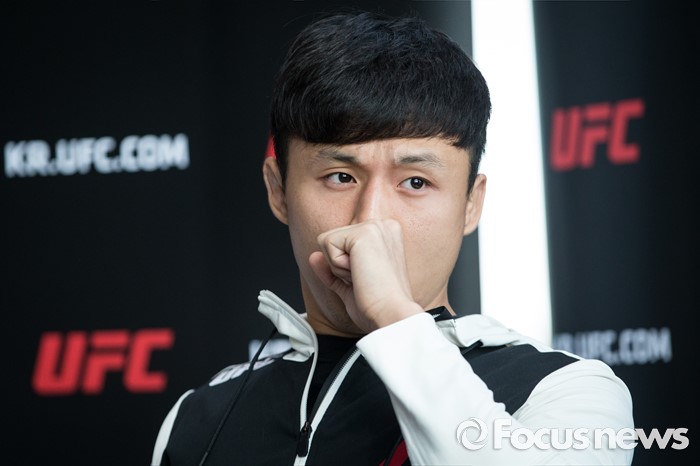 (서울=포커스뉴스) 지난 9일 티아고 타바레스(31, 브라질)를 1라운드 2분 42초에 TKO로 제압하고, UFC 3연속 KO 승리라는 쾌거를 이루고 귀국한 ‘코리안 슈퍼보이’ 최두호가 선수가 12일 오전 서울 여의도 리복 센티널 IFC에서 기자회견을 하고 있다.