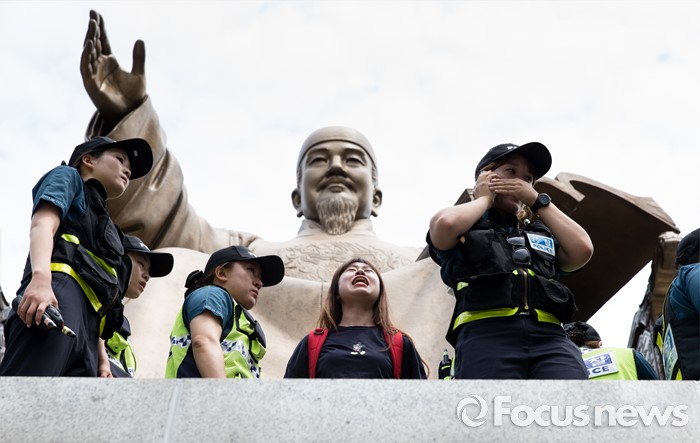 (서울=포커스뉴스) 12일 오전 서울 종로구 광화문광장 세종대왕 동상에서 알바연대알바노조가 최저임금 1만원 인상을 요구하며 기습시위를 벌이고 있다.
