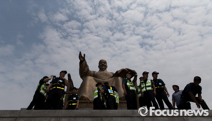 (서울=포커스뉴스) 12일 오전 서울 종로구 광화문광장 세종대왕 동상에서 알바연대알바노조가 최저임금 1만원 인상을 요구하며 기습시위를 벌이고 있다.
