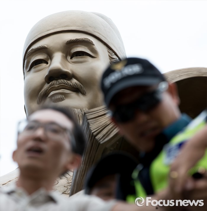 (서울=포커스뉴스) 12일 오전 서울 종로구 광화문광장 세종대왕 동상에서 알바연대알바노조가 최저임금 1만원 인상을 요구하며 기습시위를 벌이고 있다.