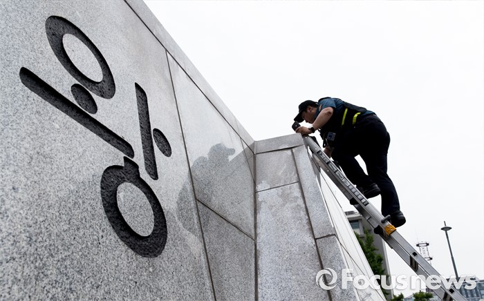 (서울=포커스뉴스) 12일 오전 서울 종로구 광화문광장 세종대왕 동상에서 최저임금 1만원 인상을 요구하며 시위를 벌이는 알바연대알바노조를 연행하기 위해 경찰이 다가가고 있다.