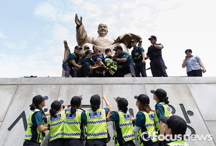 (서울=포커스뉴스) 12일 오전 서울 종로구 광화문광장 세종대왕 동상에서 최저임금 1만원 인상을 요구하며 시위를 하던 알바연대알바노조가경찰에게 연행되고 있다.