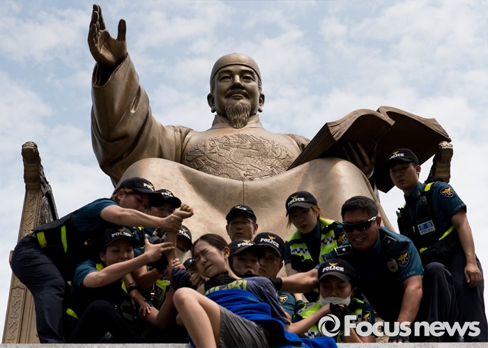 (서울=포커스뉴스) 12일 오전 서울 종로구 광화문광장 세종대왕 동상에서 최저임금 1만원 인상을 요구하며 시위를 하던 알바연대알바노조가경찰에게 연행되고 있다.