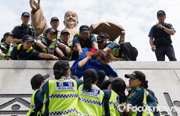 (서울=포커스뉴스) 12일 오전 서울 종로구 광화문광장 세종대왕 동상에서 최저임금 1만원 인상을 요구하며 시위를 하던 알바연대알바노조가경찰에게 연행되고 있다.