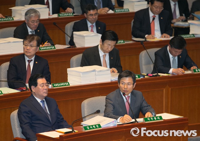 (서울=포커스뉴스) 12일 오전 서울 여의도 국회에서 2015회계연도 결산을 위해 열린 예산결산특별위원회 전체회의에 참석한 황교안 국무총리가 의원들의 질의에 답하고 있다.