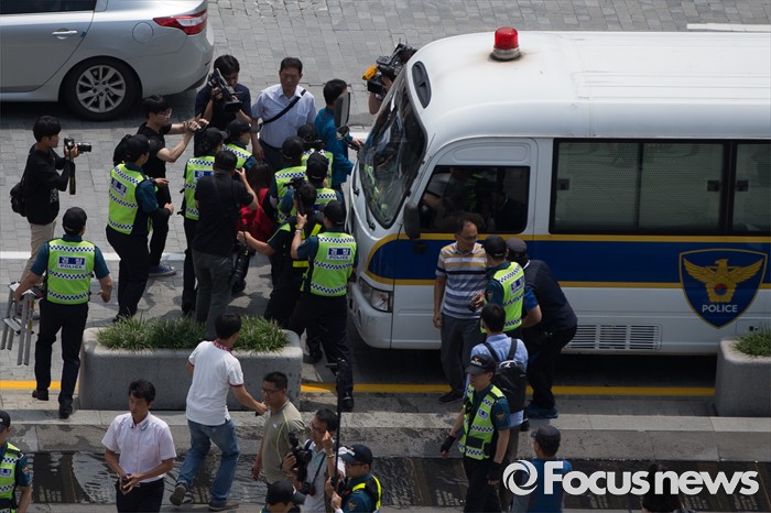 (서울=포커스뉴스) 12일 오전 서울 종로구 광화문광장 세종대왕 동상에서 알바연대알바노조가 최저임금 1만원 인상을 요구하며 기습시위를 벌이던 중 경찰들에게 제지당하고 있다.