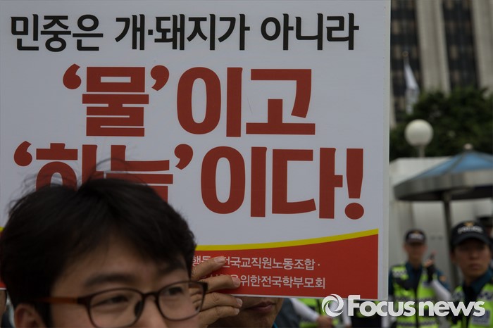 (서울=포커스뉴스) 12일 오전 서울 종로구 정부서울청사 앞에서 교육운동연대원들이 교육부 망언 고위관료 파면을 촉구하며 기자회견을 갖고 있다.