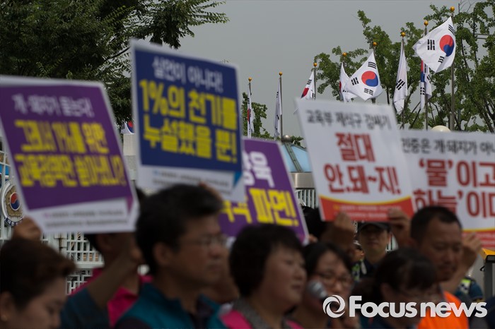 (서울=포커스뉴스) 12일 오전 서울 종로구 정부서울청사 앞에서 교육운동연대원들이 교육부 망언 고위관료 파면을 촉구하며 기자회견을 갖고 있다.