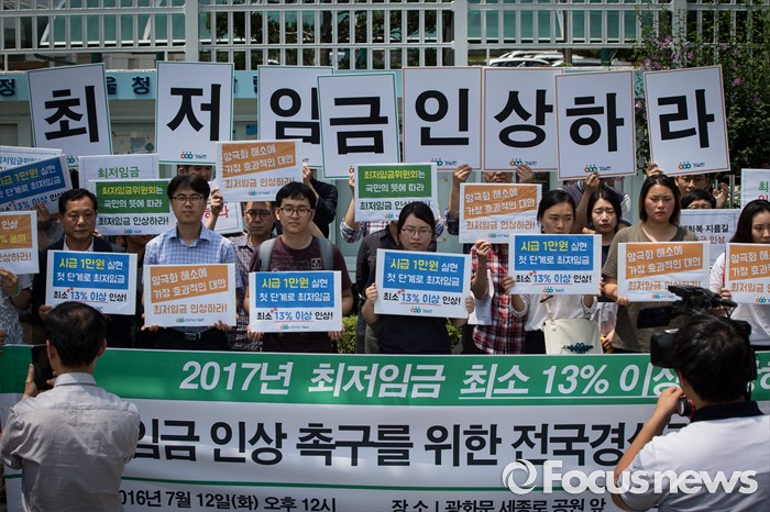 (서울=포커스뉴스) 경제정의실천시민연합 회원들이 12일 오후 서울 종로구 정부서울청사 앞에서 최저임금 인상 촉구 합동 기자회견을 하고 있다.