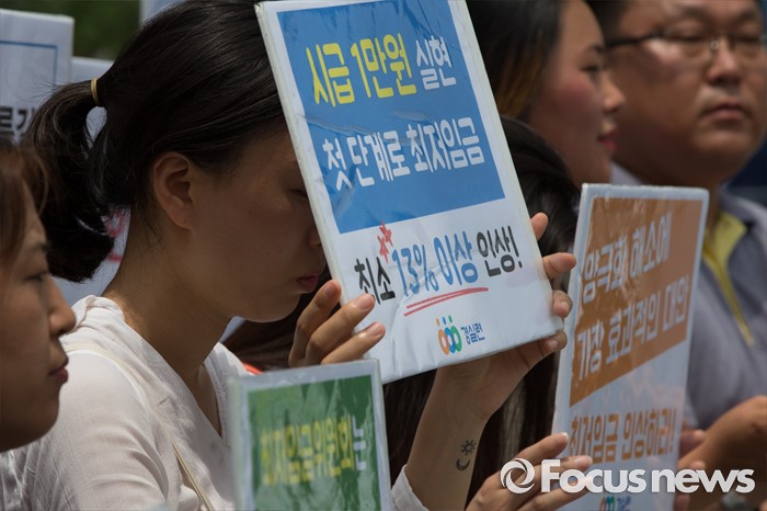 (서울=포커스뉴스) 경제정의실천시민연합 회원들이 12일 오후 서울 종로구 정부서울청사 앞에서 최저임금 인상 촉구 합동 기자회견을 하고 있다.