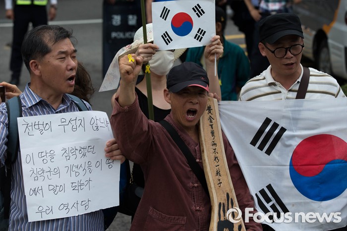 (서울=포컷뉴스) 12일 오후 서울 중구 밀레니엄서울힐튼호텔 앞에서 '일본 자위대 62주년 창설 기념식'을 규탄하는 시민단체들의 시위가 열리고 있다.