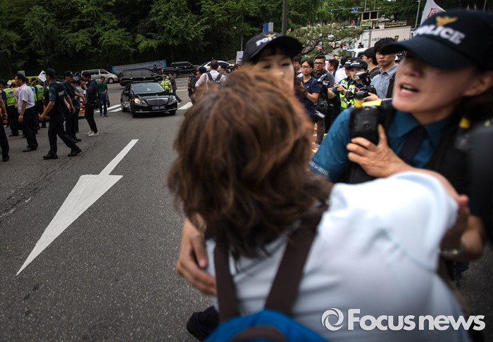 | △ 필리핀 대사 차량 진입 막으려는 시민단체 회원 |