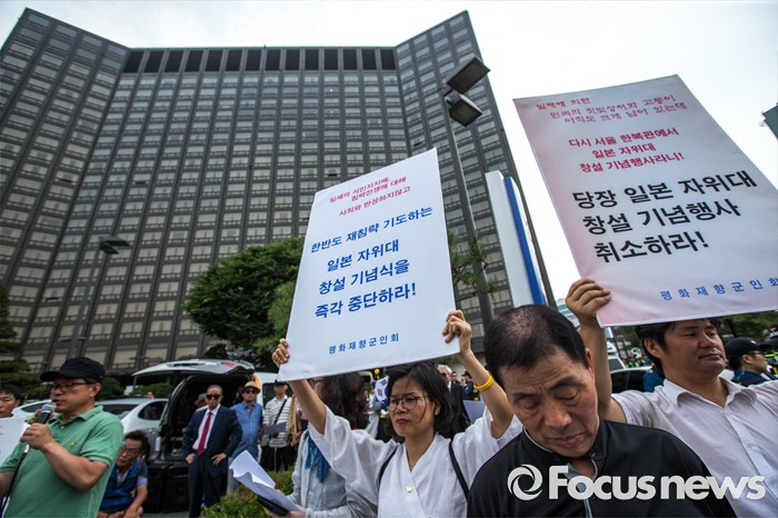 (서울=포컷뉴스) 12일 오후 서울 중구 밀레니엄서울힐튼호텔 앞에서 '일본 자위대 62주년 창설 기념식'을 규탄하는 시민단체들의 시위가 열리고 있다.