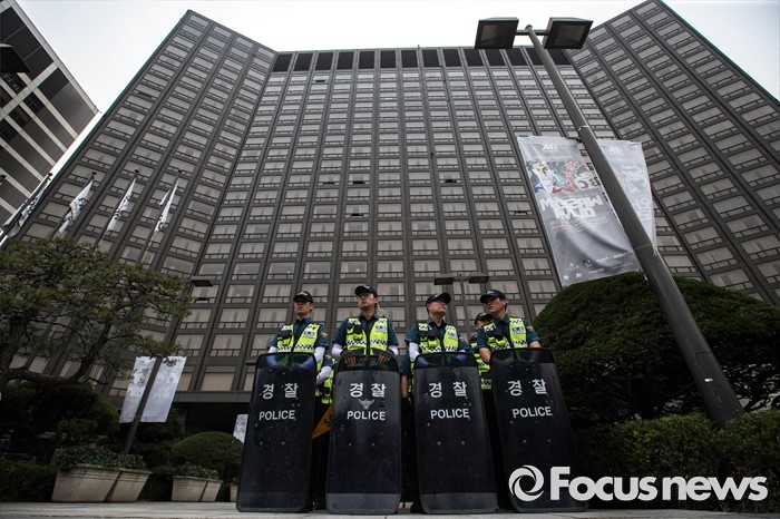(서울=포컷뉴스) 12일 오후 서울 중구 밀레니엄서울힐튼호텔 앞에서 '일본 자위대 62주년 창설 기념식'을 규탄하는 시민단체들의 시위가 열리고 있다.