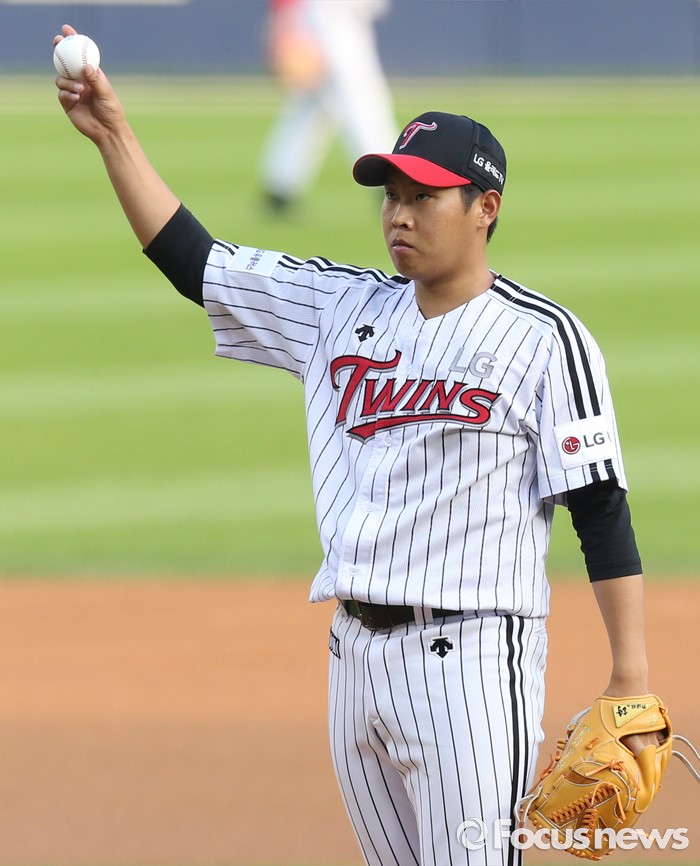 (서울=포커스뉴스) 12일 서울 잠실구장에서 열린 2016 프로야구 한화-LG 경기에서 1회초 LG 선발투수 유경국이 투구전 포수에게 사인을 보내고 있다.