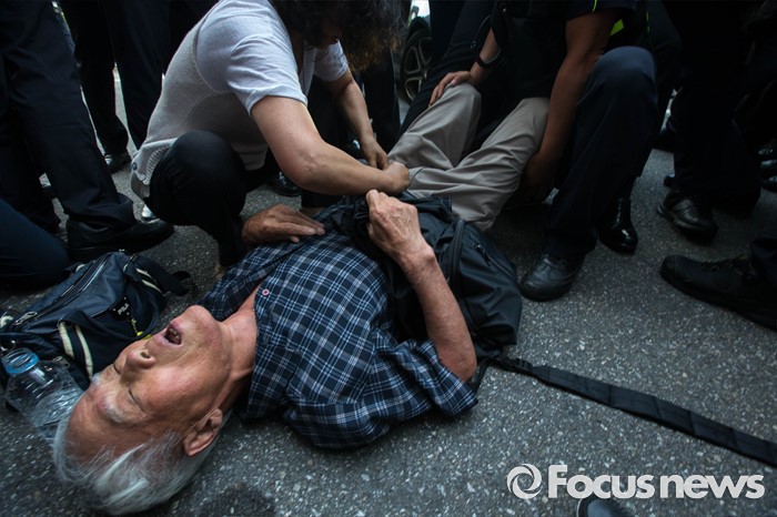 (서울=포컷뉴스) 12일 오후 서울 중구 밀레니엄서울힐튼호텔 앞에서 '일본 자위대 62주년 창설 기념식'을 규탄하는 시민단체들의 시위가 열리고 있는 가운데 한 시민이 격렬한 몸싸움 도중 쓰러져 있다.