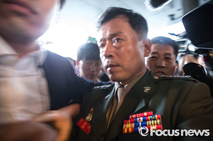 (서울=포컷뉴스) 12일 오후 서울 중구 밀레니엄서울힐튼호텔 앞에서 '일본 자위대 62주년 창설 기념식'을 규탄하는 시민단체들의 시위가 열리고 있는 가운데 김용해 해병대 대령이 행사장으로 들어서고 있다.