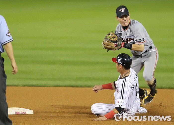 (서울=포커스뉴스) 12일 서울 잠실구장에서 열린 2016 프로야구 한화-LG 경기 6회말 1사 만루에서 LG 이병규의 2루수앞 땅볼때 1루주자 오지환이 2루에서 포스아웃되고 있다.