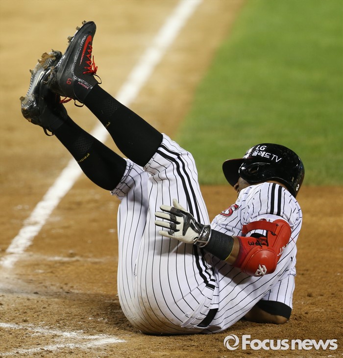 (서울=포커스뉴스) 12일 서울 잠실구장에서 열린 2016 프로야구 한화-LG 경기 7회말 2사 2루에서 LG 히메네스가 발에 볼을 맞고 타석에서 뒹굴고 있다.