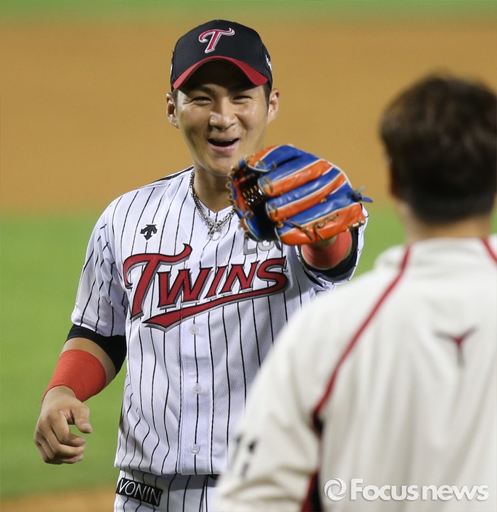 (서울=포커스뉴스) 12일 서울 잠실구장에서 열린 2016 프로야구 한화-LG 경기에서 한화에 5-4, 1점차 짜릿한 역전승을 거둔 LG의 마지막 아웃 카운트를 잡은 오지환이 기뻐하고 있다.
