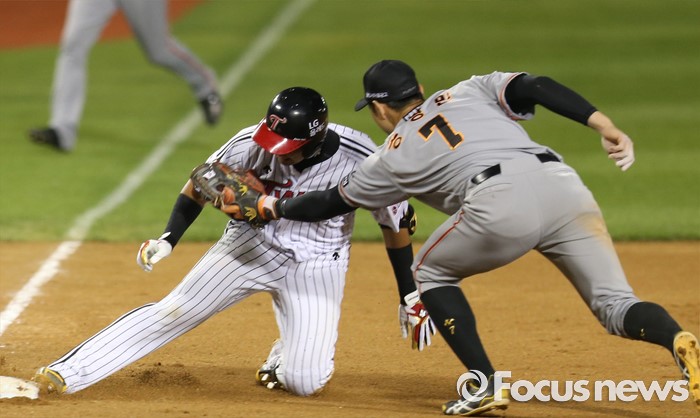 (서울=포커스뉴스) 12일 서울 잠실구장에서 열린 2016 프로야구 한화-LG 경기 7회말 2사 1,2루에서 LG 채은성이 2타점 우중간 3루타를 치고 슬라이딩하며 세이프되고 있다.
