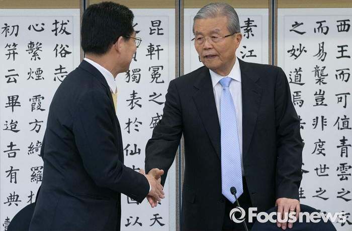 (서울=포커스뉴스) 13일 오전 서울 여의도 국회 귀빈식당에서 열린 더불어민주당 저출산 해소를 위한 국민연금 공공투자 특별위원회 1차 정책협의회에 참석한 김종인(오른쪽) 비대위 대표와 양승조 보건복지위원장이 인사하고 있다.