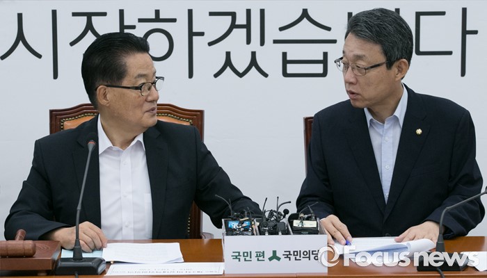 (서울=포커스뉴스) 13일 오전 서울 여의도 국회에서 열린 국민의당 비상대책위원회의에 참석한 박지원(왼쪽) 비대위원장과 김성식 정책위의장이 대화하고 있다.
