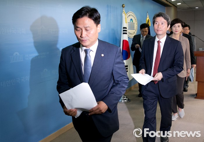 (서울=포커스뉴스) 13일 오전 서울 여의도 국회 정론관에서 더불어민주당 민주평화국민연대(이하 민평련) 소속 의원들이 한반도 및 동북아지역의 평화와 협력을 위협하는 사드배치 반대 기자회견을 마친 뒤 퇴장하고 있다.
