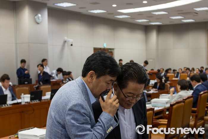(서울=포커스뉴스) 국회 운영위원회 국민의당 소속 박지원(오른쪽) 비상대책위원장과 국민의당 간사 김관영 원내수석부대표가 13일 오전 서울 여의도 국회에서 열린 '운영위원회 전체회의'에 참석해 대화 하고 있다.