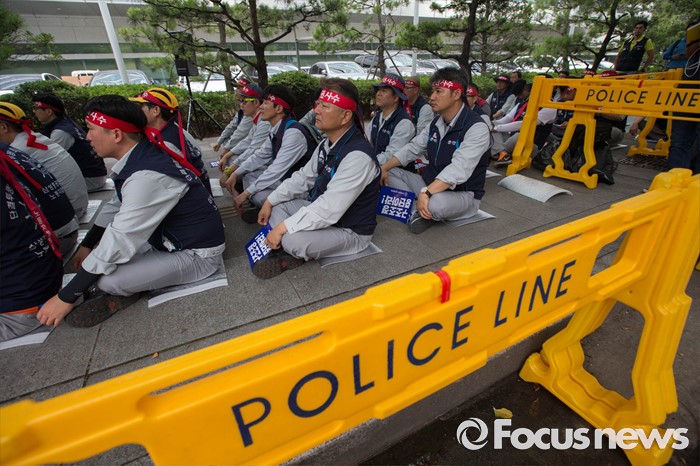 (서울=포커스뉴스) 13일 오전 서울 여의도 산업은행 본점 앞에서 삼성중공업 노동자협의회 관계자들이 고용안정 요구 및 정부의 조선업 구조조정을 규탄하는 상경 집회를 하고 있다.