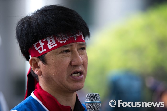 (서울=포커스뉴스) 13일 오전 서울 여의도 산업은행 본점 앞에서 삼성중공업 노동자협의회 관계자들이 고용안정 요구 및 정부의 조선업 구조조정을 규탄하는 상경 집회를 하고 있다.