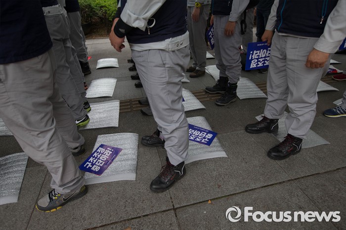 (서울=포커스뉴스) 13일 오전 서울 여의도 산업은행 본점 앞에서 삼성중공업 노동자협의회 관계자들이 고용안정 요구 및 정부의 조선업 구조조정을 규탄하는 상경 집회를 하고 있다.