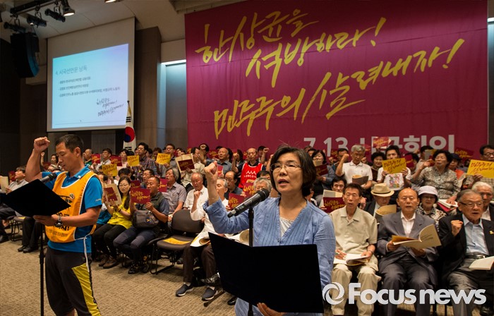(서울=포커스뉴스) 13일 오전 서울 중구 프레스센터에서 열린 '한상균을 석방하라, 민주주의 살려내자' 7.13 시국회의에 참석한 시국선언인단이 시국선언문 낭독 후 구호를 외치고 있다.