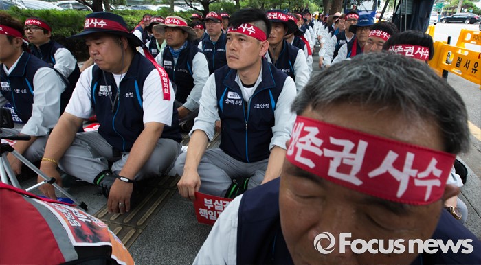 (서울=포커스뉴스) 13일 오전 서울 여의도 산업은행 본점 앞에서 삼성중공업 노동자협의회 관계자들이 고용안정 요구 및 정부의 조선업 구조조정을 규탄하는 상경 집회를 하고 있다.
