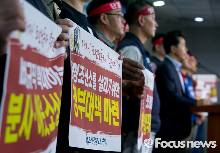(서울=포커스뉴스) 13일 오전 서울 여의도 국회 정론관에서 조선업종노조연대 등 관계자들이 일방적 구조조정에 반대하는 총파업 선언 기자회견을 하고 있다.