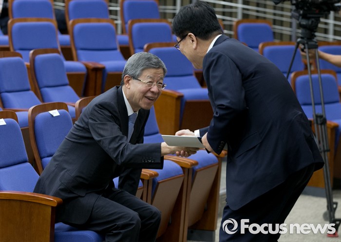 (서울=포커스뉴스) 13일 오후 서울 여의도 국회에서 열린 포용적 시장경제와 새누리당의 진로 토크 콘서트에 참석한 김희옥(왼쪽) 혁신비대위원장과 김광림 정책위의장이 악수하고 있다.