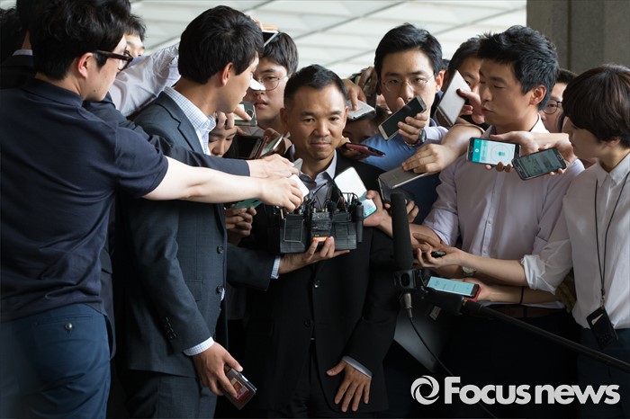 (서울=포커스뉴스) 진경준 검사장의 '주식대박' 의혹과 관련해 넥슨 창업주 김정주 NXC(넥슨지주회사) 회장이 13일 오후 서울 서초구 서울중앙지방검찰청으로 들어서기 전 취재진의 질문을 받고 있다.